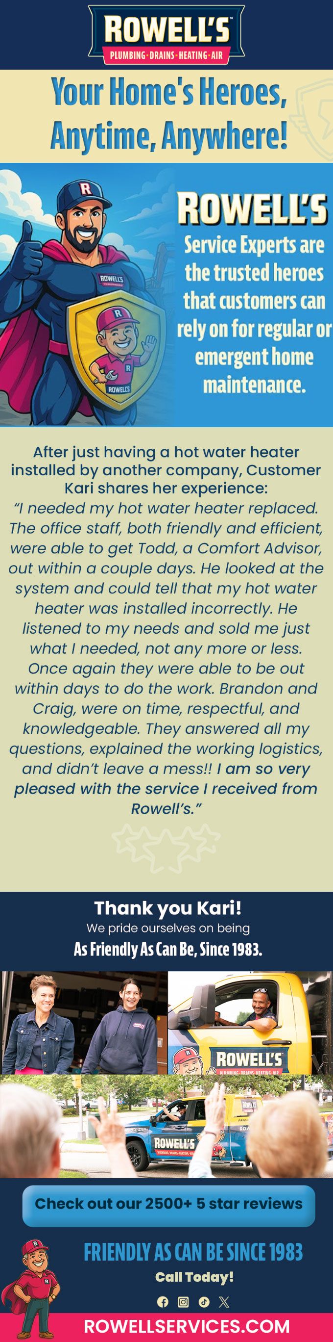 "I needed my hot water heater replaced. The office staff, both friendly and efficient, were able to get Todd, a Comfort Advisor, out within a couple days. He looked at the system and could tell that my hot water heater was installed incorrectly. He listened to my needs and sold me just what I needed, not any more or less. Once again they were able to be out within days to do the work. Brandon and Craig, were on time, respectful, and knowledgeable. They answered all my questions, explained the working logistics, and didn't leave a mess!! I am so very pleased with the service I received from Rowell's."